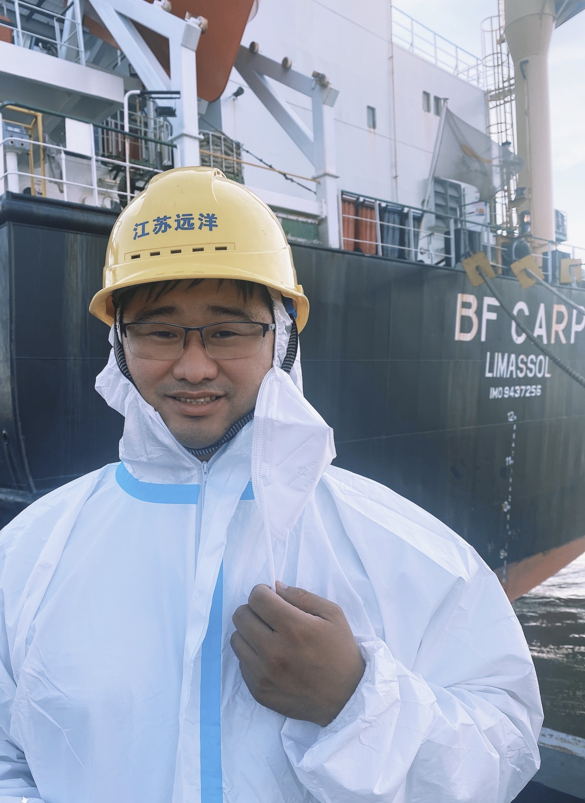 今年我選擇了在船上堅(jiān)守崗位。此時(shí)我輪在青島港碼頭裝貨,我和弟兄們一起,毫不松懈繼續(xù)嚴(yán)格落實(shí)落細(xì)各項(xiàng)疫情防控措施,加強(qiáng)對(duì)外來(lái)上船人員的防控管理,從政治高度做好疫情防控工作。