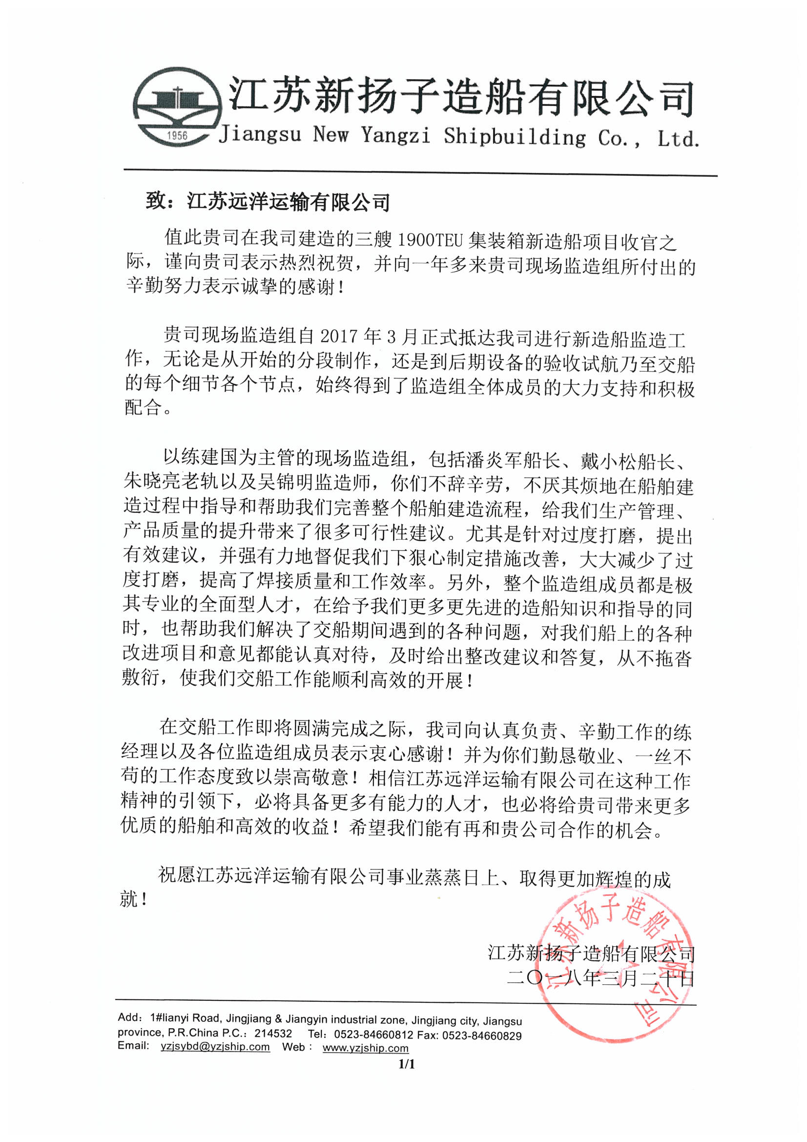 江蘇新?lián)P子造船公司給我司建造組發(fā)來(lái)感謝信