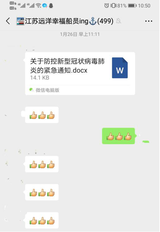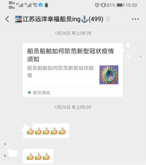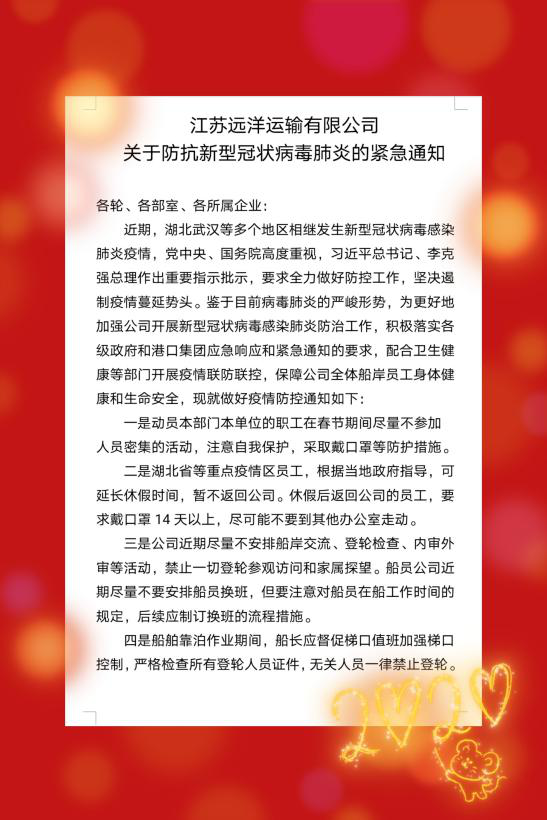 江蘇遠(yuǎn)洋黨委深入貫徹習(xí)近平總書記對新冠肺炎疫情作出的重要指示精神,全面落實(shí)《省港口集團(tuán)關(guān)于進(jìn)一步做好全集團(tuán)系統(tǒng)疫情防控工作的通知》等文件要求,研究部署做好新型冠狀病毒感染肺炎防控工作。