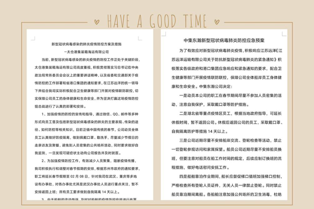 太倉海運(yùn)、中集東瀚、船員公司在公司的統(tǒng)一部署下,結(jié)合各公司業(yè)務(wù)情況及當(dāng)?shù)匾咔椋皶r通過微信群、郵件等方式下發(fā)《太倉港集裝箱海運(yùn)有限公司新型冠狀病毒感染的肺炎疫情防控方案及措施》《中集東瀚新型冠狀病毒肺炎防控應(yīng)急預(yù)案》《船員公司加強(qiáng)預(yù)防新型冠狀病毒肺炎感染的通電》,確保公司黨委對防控工作要求傳達(dá)到每名船岸職工。