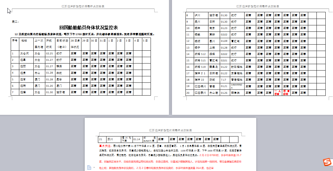 嚴(yán)格監(jiān)測(cè)排查。每天由專人負(fù)責(zé)對(duì)每名船員進(jìn)行體溫測(cè)量,建立“防疫工作日志”。對(duì)有類似癥狀的船員,做好預(yù)防隔離,密切跟蹤身體健康狀況,并及時(shí)向公司通報(bào)船員癥狀。對(duì)于靠泊期間發(fā)現(xiàn)任何外來(lái)人員有類似感冒、咳嗽、發(fā)燒等癥狀時(shí),立即驅(qū)離船舶并同時(shí)通知代理和工頭或有關(guān)管理部門處理。