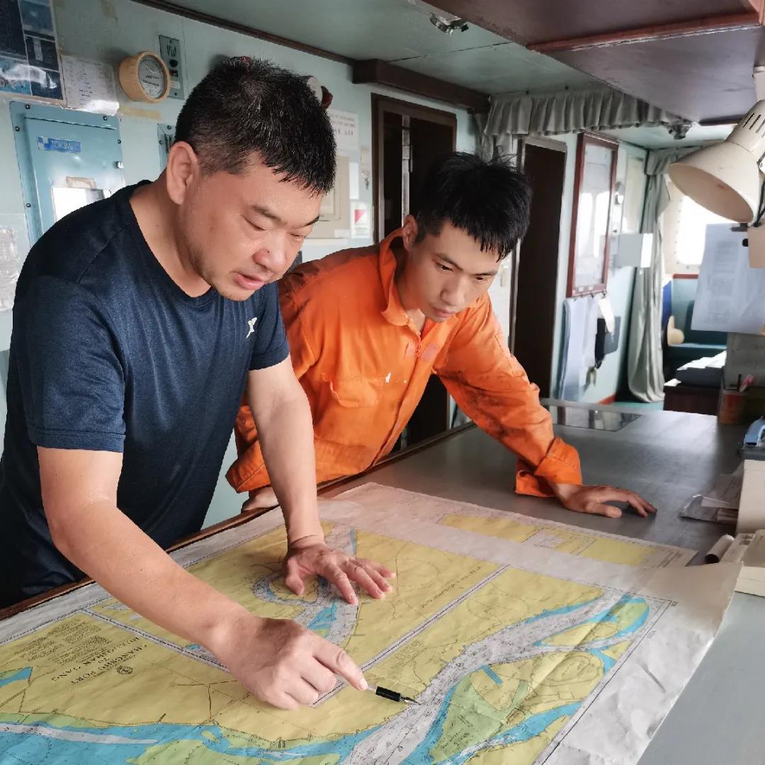 陳船長(zhǎng)和駕駛員及時(shí)收集最新的長(zhǎng)江航行通告和相關(guān)信息,了解航道中浮筒位置和航道水深情況,對(duì)照航海圖書資料和航行計(jì)劃進(jìn)行研究,根據(jù)最新信息將海圖改正至最新,并制訂出最佳的航行和操作方案。