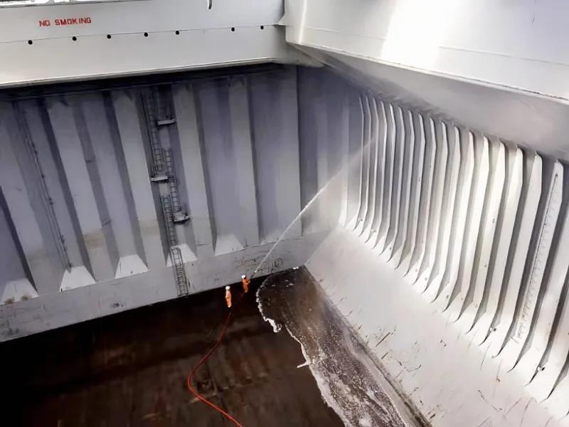 備艙并非想的那么容易,由于多個(gè)裝卸港口設(shè)備碾壓,形成了很多緊緊貼附在艙底、下斜坡上的垃圾塊。如果使用化學(xué)藥劑清洗,貨艙污水就不能排放入海,需要岸上接收,會(huì)產(chǎn)生大筆費(fèi)用。只能靠船員一點(diǎn)點(diǎn)鏟刷,一個(gè)個(gè)貨艙慢慢清理。人停機(jī)不停,船員根據(jù)值班時(shí)間輪班工作,連續(xù)工作數(shù)個(gè)晝夜,最終在土耳其結(jié)束卸貨前就完成了大部分貨艙的準(zhǔn)備和清洗工作。清洗后貨艙污水暫留于污水井內(nèi),污水量大的艙內(nèi)將部分貨艙污水轉(zhuǎn)駁至搜集柜內(nèi),便于艙底清洗工作繼續(xù)開(kāi)展。